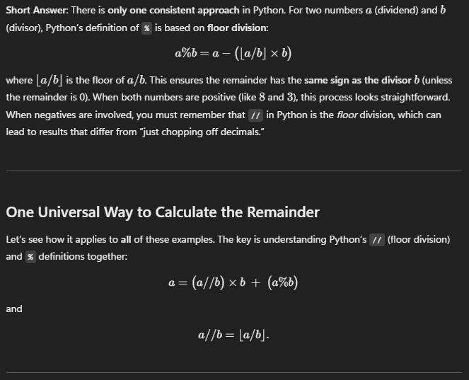 | % | Remainder (modulo) | 5 % 2 | 5 mod 2 | 1 | int if both arguments are ints float otherwise raises ZeroDivisionError when divisor is zero |